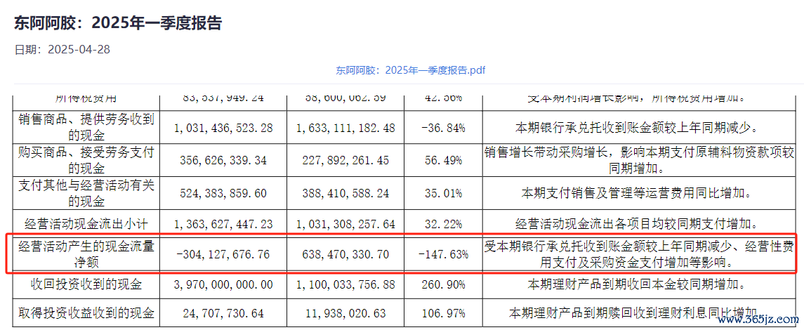 记者注意到,东阿阿胶在一季度公告中,对多个财务指标的增减做出了说明。应收账款增加系本期使用授信额度发货新增应收账款影响;经营活动产生的现金流量净额减少系受本期银行承兑托收到账金额较上年同期减少、经营性费用支付及采购资金支付增加等影响。